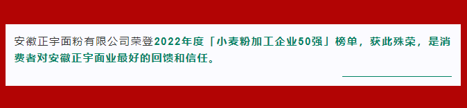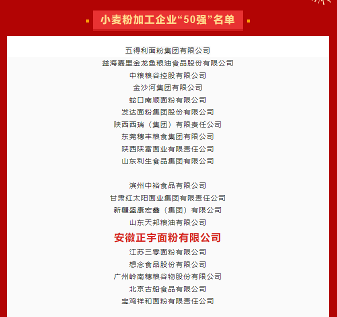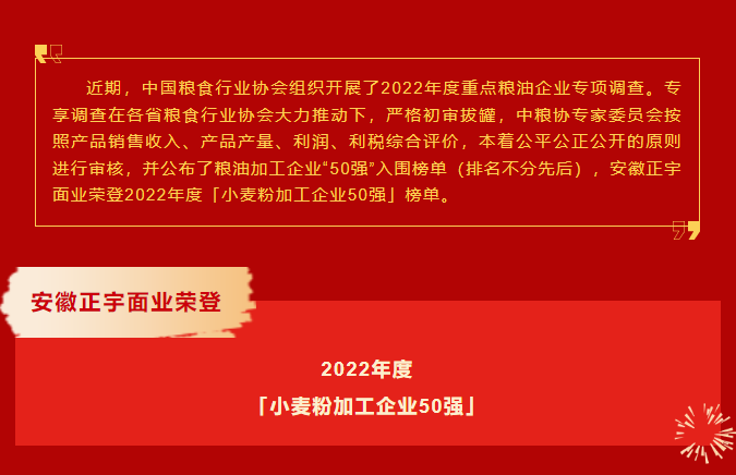 喜報!安徽正宇面業(yè)榮登2022年度「小麥粉加工企業(yè)50強」榜單